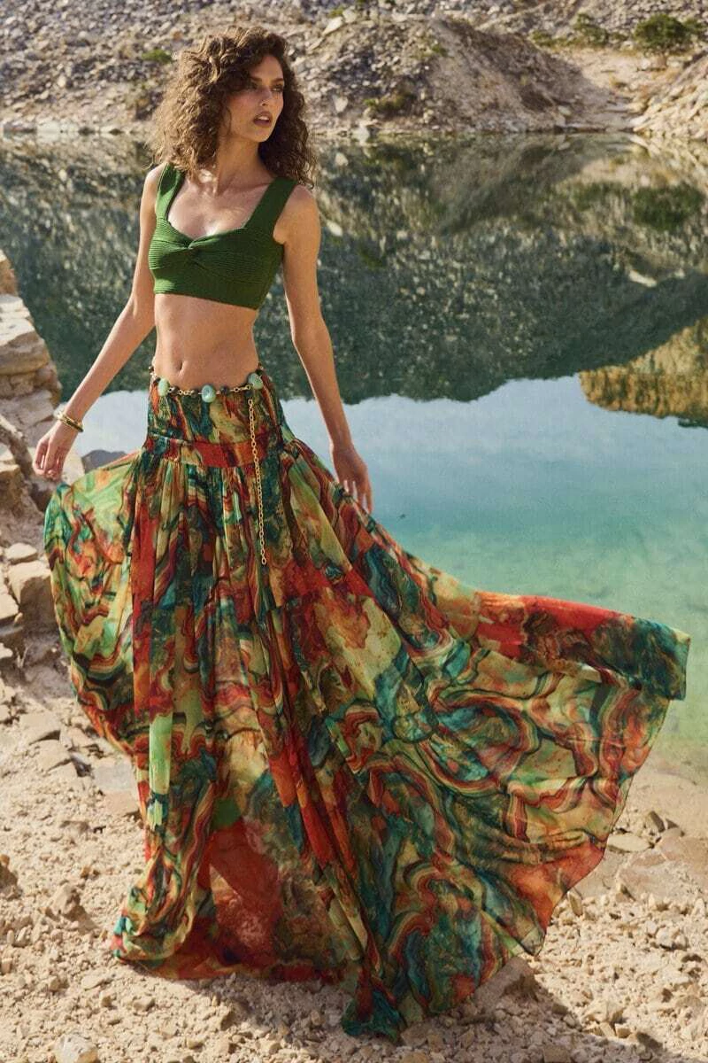 The Riviera Minerale Skirt in the exclusive 2ARES print, inspired by the natural beauty of minerals, is a versatile and striking piece—perfect for special occasions, travel, or effortless-chic moments. The Minerale print comes to life with vibrant tones and organic lines that enhance the light, fluid movement of the skirt.