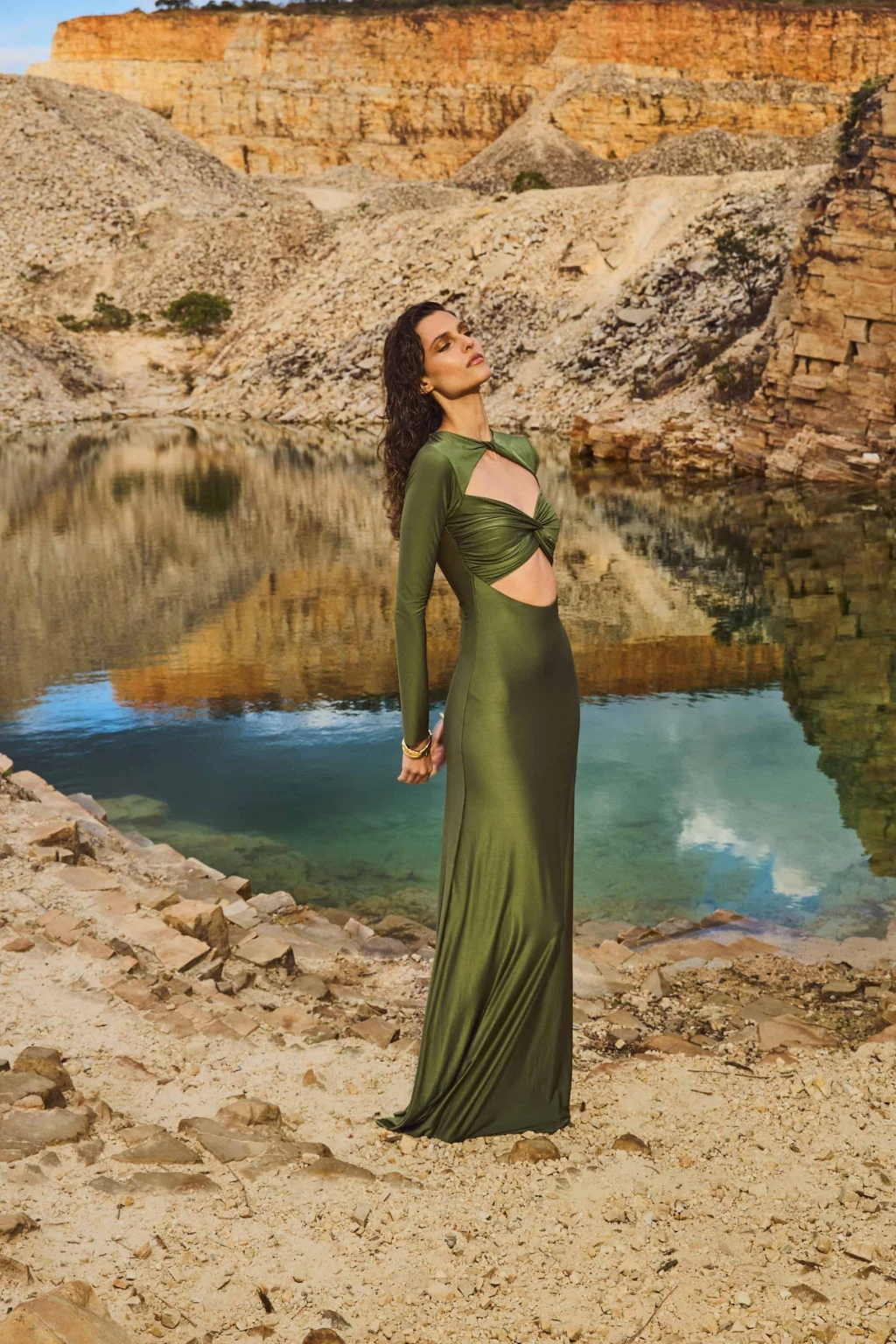 The Emma Minerale Dress is the perfect choice for special occasions. Designed with a straight, elongated silhouette, it enhances the figure with refined sophistication. Featuring long sleeves and front cutouts, the dress reveals a unique design with delicate twists. The fabric’s shimmering effect adds personality and allure to the piece. Made from stretch fabric, it offers comfort and elegance without closures. Composition: 90% Polyamide, 10% Elastane.