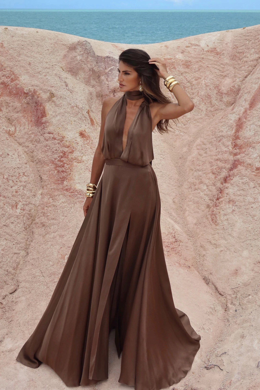 O Vestido Layla Luminare é a tradução da elegância fluida. Confeccionado em seda pura, apresenta modelagem com decote profundo e amarração no pescoço, que traz um toque de leve sensualidade e refinamento.